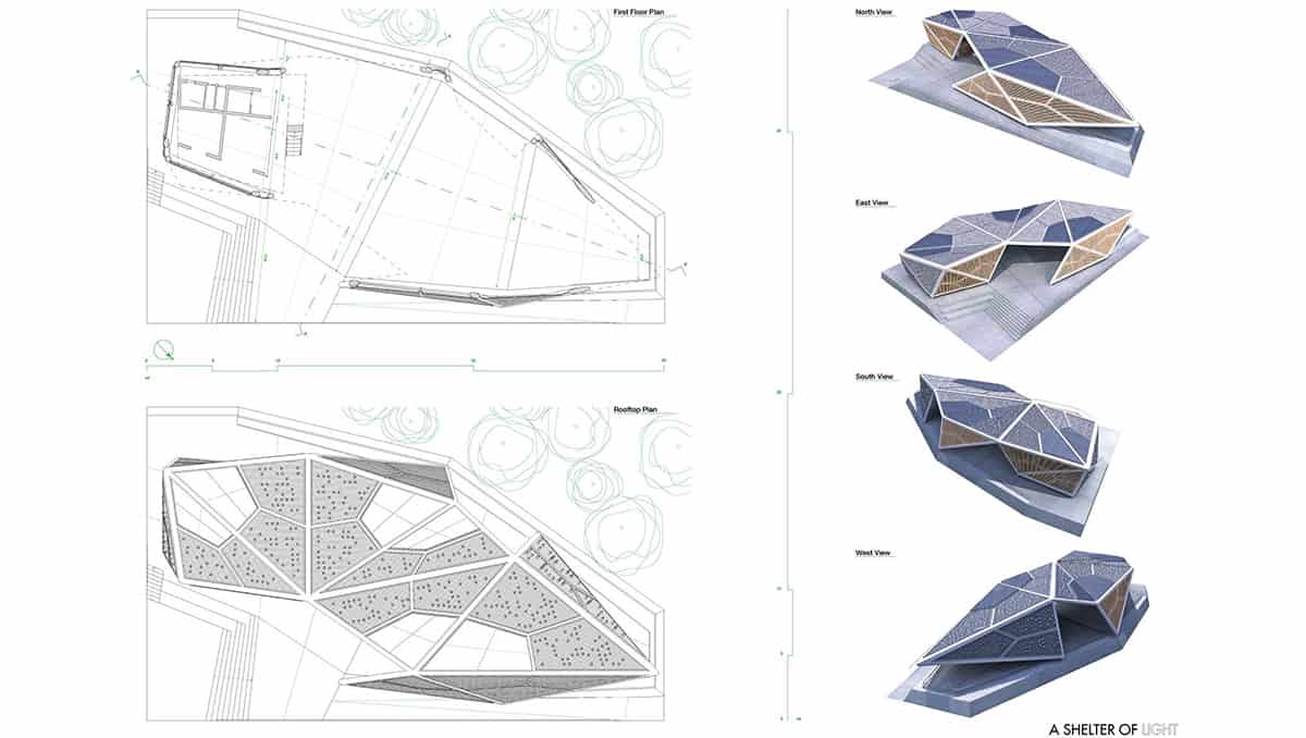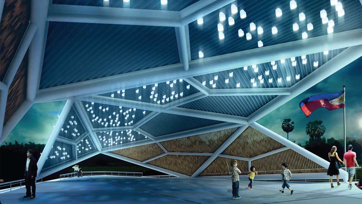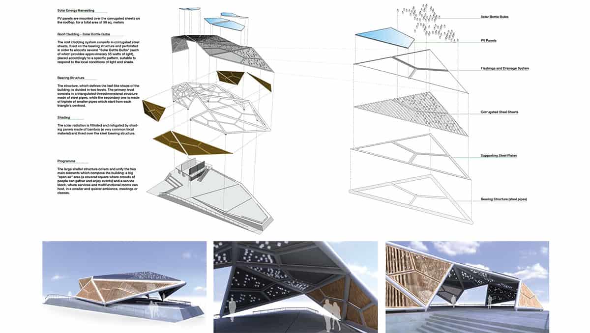 A Shelter of Light is a design concept for an eco-friendly multipurpose public hall in Payatas, Quezon City. It is a partnership project with My Shelter Foundation that uses efficient and recyclable materials such as bamboo, plastic soda bottles, solar panels, and Onduline.