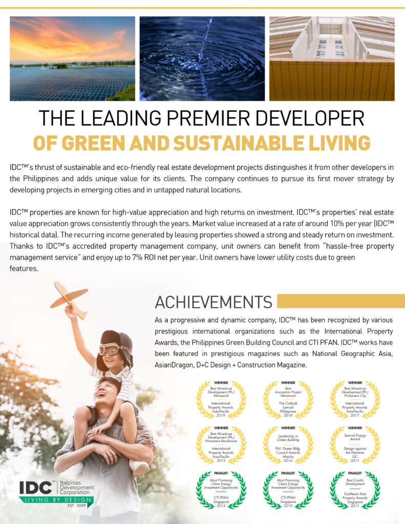 IDC thrust of sustainable and eco-friendly real estate development projects distinguishes it from other developers in the Philippines and adds unique value for its clients, the company continues to pursue its first mover strategy by developing in emerging cities and in untapped locations.